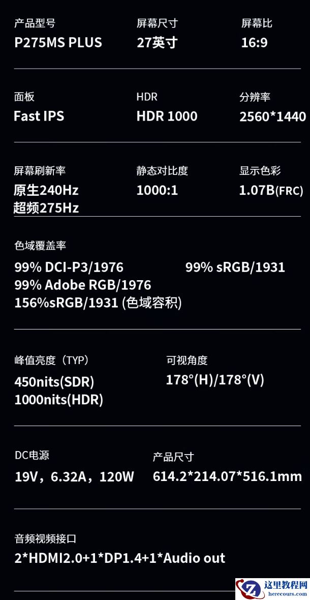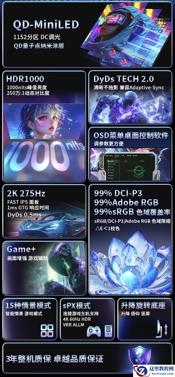 该机配备一块 2560x1440 分辨率 275Hz 超频(原生 240Hz)QD-Mini LED 背光(1152 分区)Fast IPS 面板,显示器 SDR 亮度 450 尼特,HDR 峰值亮度 1000 尼特,静态对比度 1000:1,显示器支持 10-Bit 色彩(8-Bit + FRC),覆盖 99% DCI-P3、99% sRGB 和 99% AdobeRGB 色域。