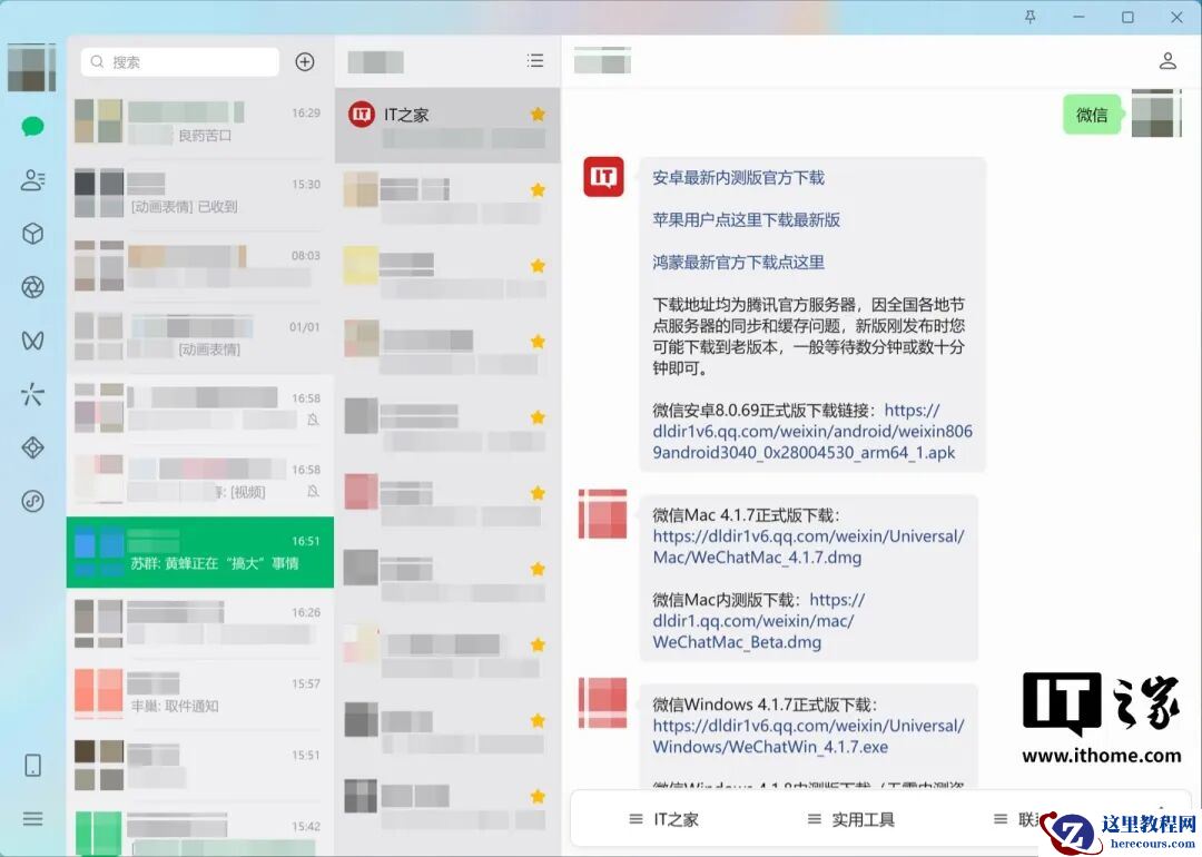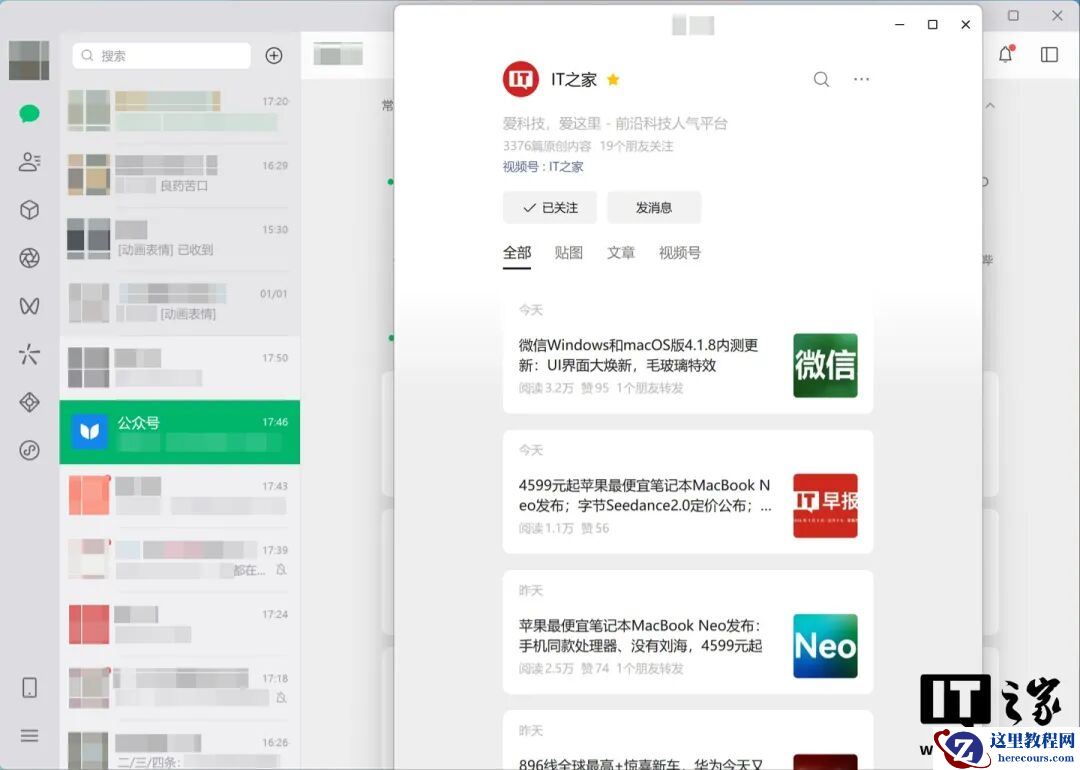 还记得在之前的 PC 4.1.4 版本中,微信就曾对主界面进行优化,添加了毛玻璃效果,适配 Windows11 24H2 及以上版本。