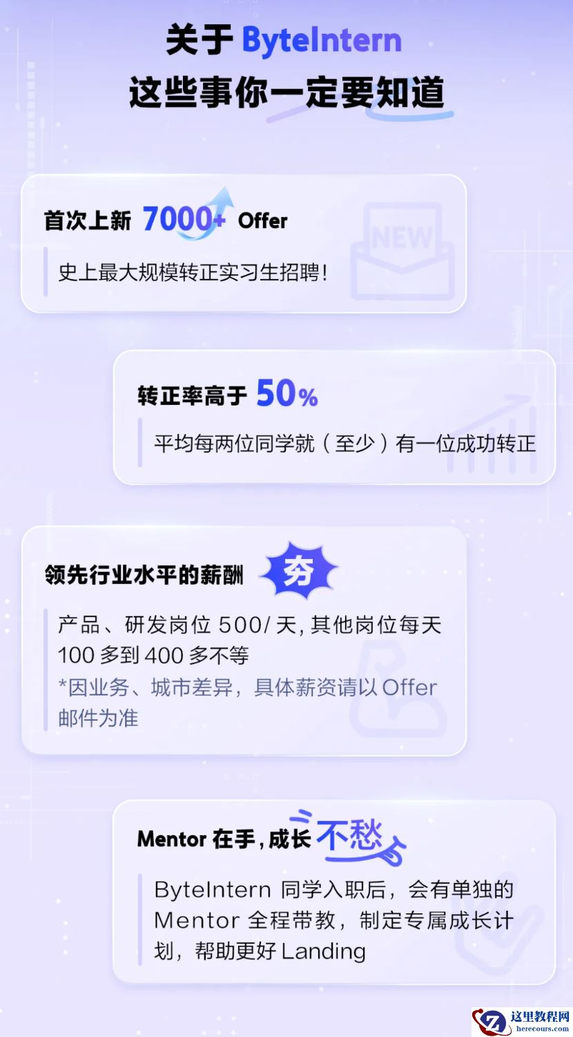 字节跳动招聘信息提到,实习生转正率高于 50%,产品、研发岗位薪酬 500 / 天,其他岗位每天 100 多到 400 多不等。