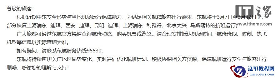 根据近期中东安全形势与当地机场运行保障能力,为满足相关航线旅客出行需求,东航将于 3 月 7 日至 3 月 12 日间,部分恢复上海浦东 = 迪拜、西安 = 迪拜、昆明 = 迪拜、上海浦东 = 利雅得、北京大兴 = 马斯喀特的航班运行。