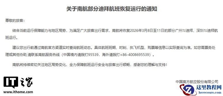 结合当前运行保障能力与地区局势,为满足广大旅客出行需求,南航将恢复 2026 年 3 月 8 日至 11 日的部分广州⇋迪拜、深圳⇋迪拜航班运行。