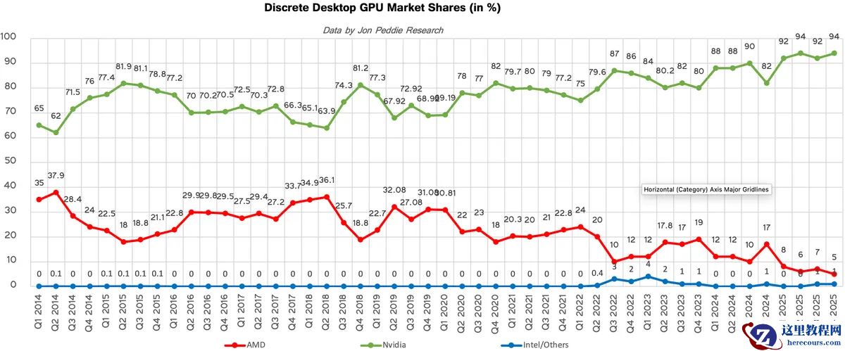 3 月 8 日消息,据市场调研机构 Jon Peddie Research 数据,2025 年台式机独显出货量达 4428 万张,达本十年第二高水平,同比增长近 1000 万张。然而去年大多数卖出去的显卡都是英伟达 GeForce,AMD Radeon 显卡销量则跌到了历史最低。