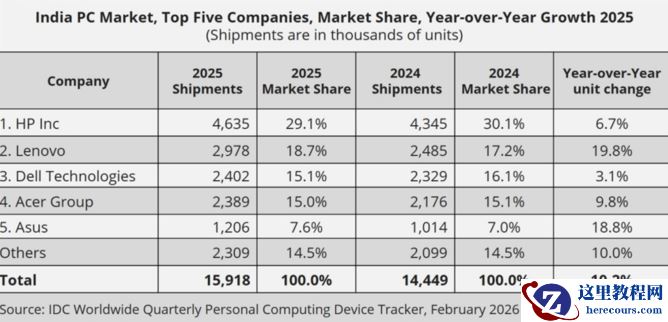 IDC 提供的数据显示,印度 PC 出货量在全球的占比从 2020 年的 3.3% 升至 2025 年的 5.6%。该机构此前报告指出,2025 年全球 PC 出货量增长 8.1%,达到 2.847 亿台。随着需求向主要城市以外扩张,这个南亚国家仍是全球增长最快的 PC 市场之一。