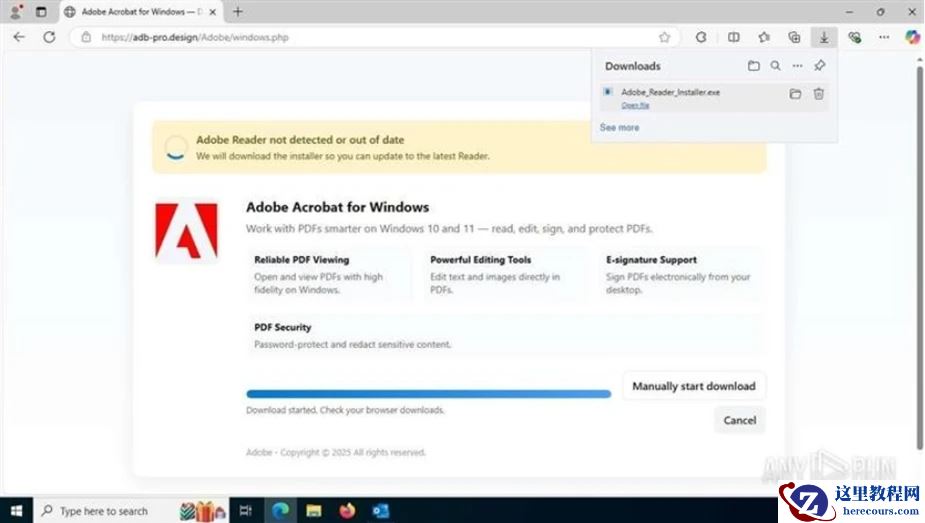 然而,点击后并不会显示文档,而是将用户重定向至一个精心伪装的仿冒网页,该页面酷似 Adobe 官方下载中心。
