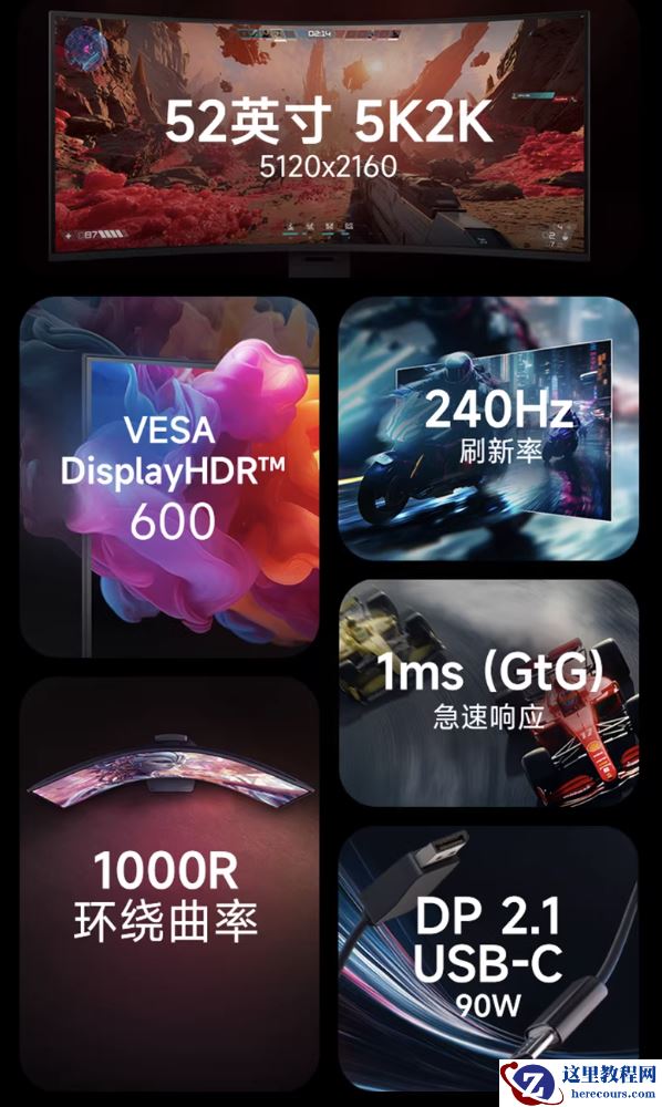 该机配备一块 5120x2160 分辨率 VA 面板,刷新率至高可达 240Hz,显示器曲率 1000R,GtG 响应速度 1ms,HDR 亮度至高 600 尼特,显示器支持 10-Bit 色彩,覆盖 95% DCI-P3 色域。