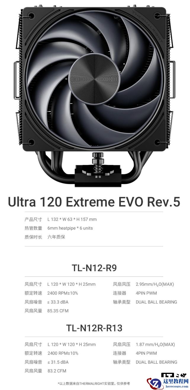 系列散热器标配 TL-N12 系列 12025 规格 LCP 风扇,内置高耐久双滚珠轴承与三相六极电机,其中进气扇(TL-N12-R9)最高转速可达 2400±10% RPM,最大风量静压分别为 83.35 CFM 和 2.95mmH2O,噪音值≤33 分贝。排气扇(TL-N12R-R13)最高转速可达 2400±10% RPM,最大风量静压分别为 83.2 CFM 和 1.87mmH2O,噪音值≤31.5 分贝。