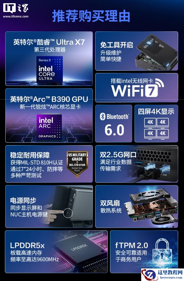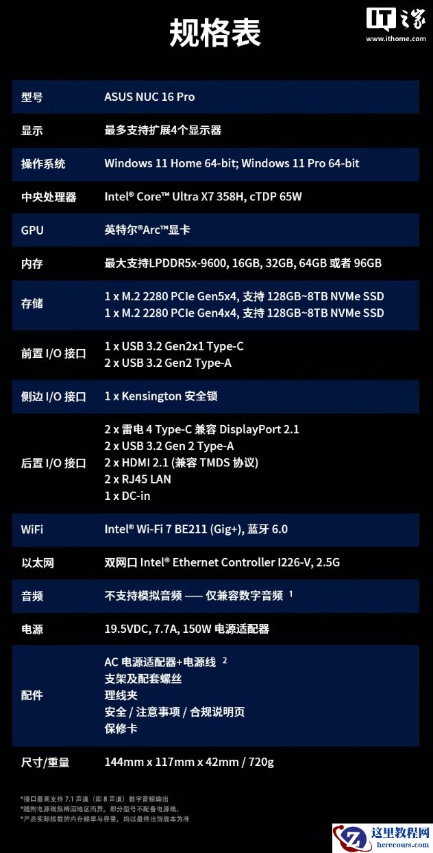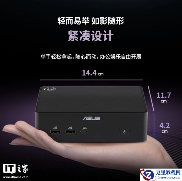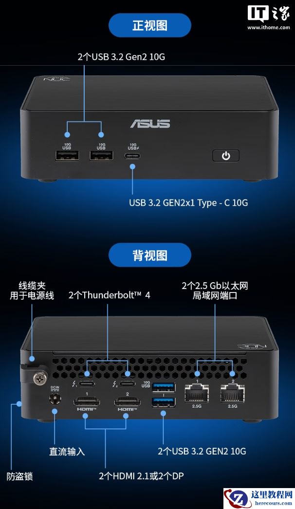 该机整体尺寸 14.4 x 11.7 x 4.2mm,整体造型低调,使用黑色配色,正面带有华硕徽标及 2 个 USB-A 3.2 Gen 2 10Gbps 接口、1 个 USB-C Gen 2 10Gbps 接口。机顶左上角带有 NUC 标识,机背提供 2 个雷电 4 接口、2 个 HDMI 2.1(可选 2 个 DP)、2 个 USB-A 3.2 Gen 2 10Gbps 接口、2 个 2.5G 网口。