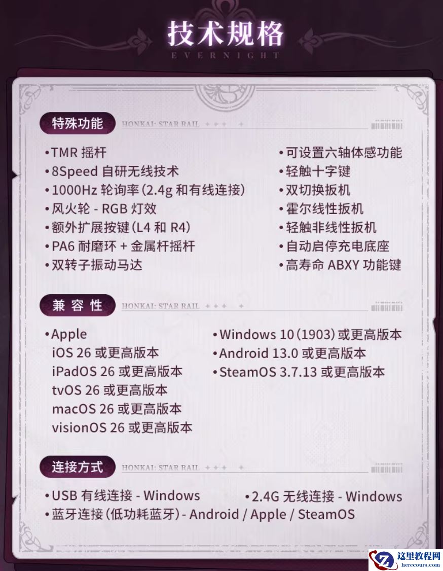 该手柄匹配 TMR 霍尔摇杆,支持六轴原生体感映射,提供 1KHz 轮循率,内置 1000 毫安时电池(续航至高 20+ 小时)。
