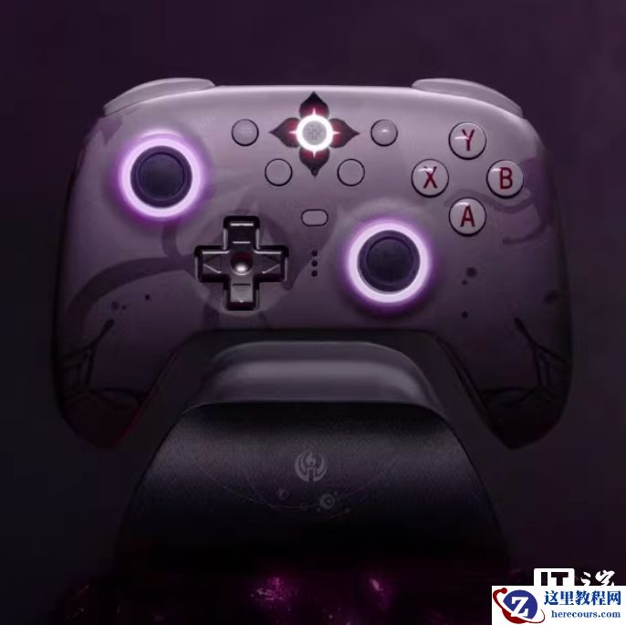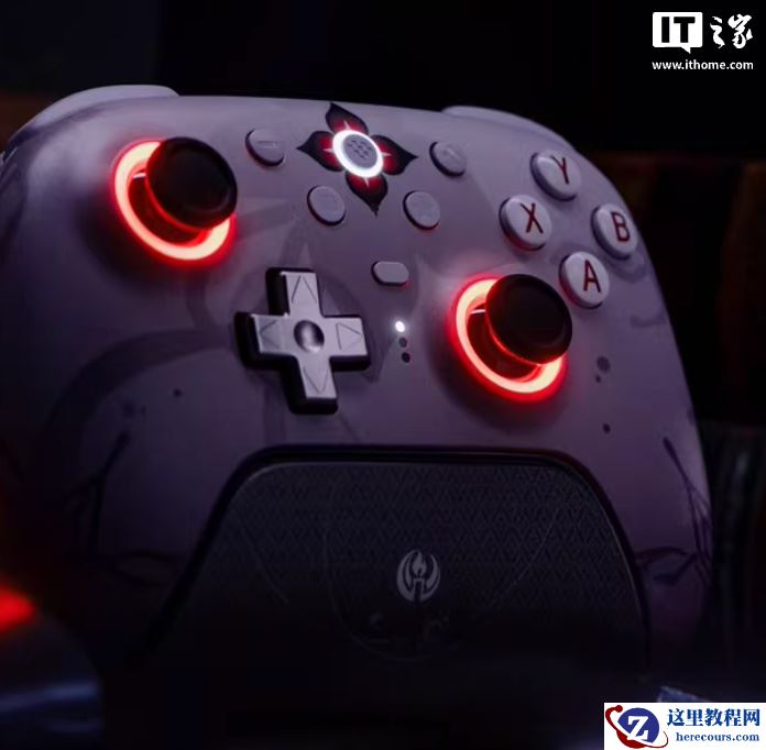 外观方面,这款手柄采用白紫渐变设计,还原了长夜月角色配色,摇杆处带有 RGB 灯,提供四个自定义功能键。