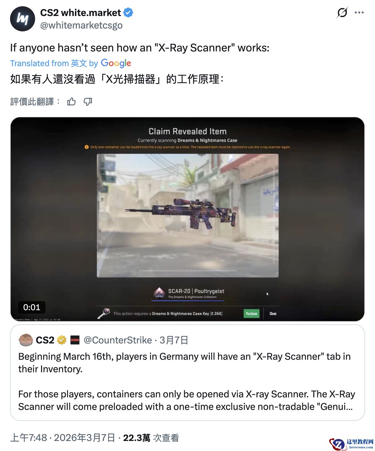 根据饰品交易平台 white.market 的分享,他首先扫描了一个箱子,发现里面是价值 0.63 美元(注:现汇率约合 4.4 元人民币)的 SCAR-20 皮肤,如果你想继续开就必须花 2.15 美元(现汇率约合 14.9 元人民币)购买“Dreams & Nightmares”钥匙,相当于多花了 1.5 美元(现汇率约合 10.4 元人民币)。