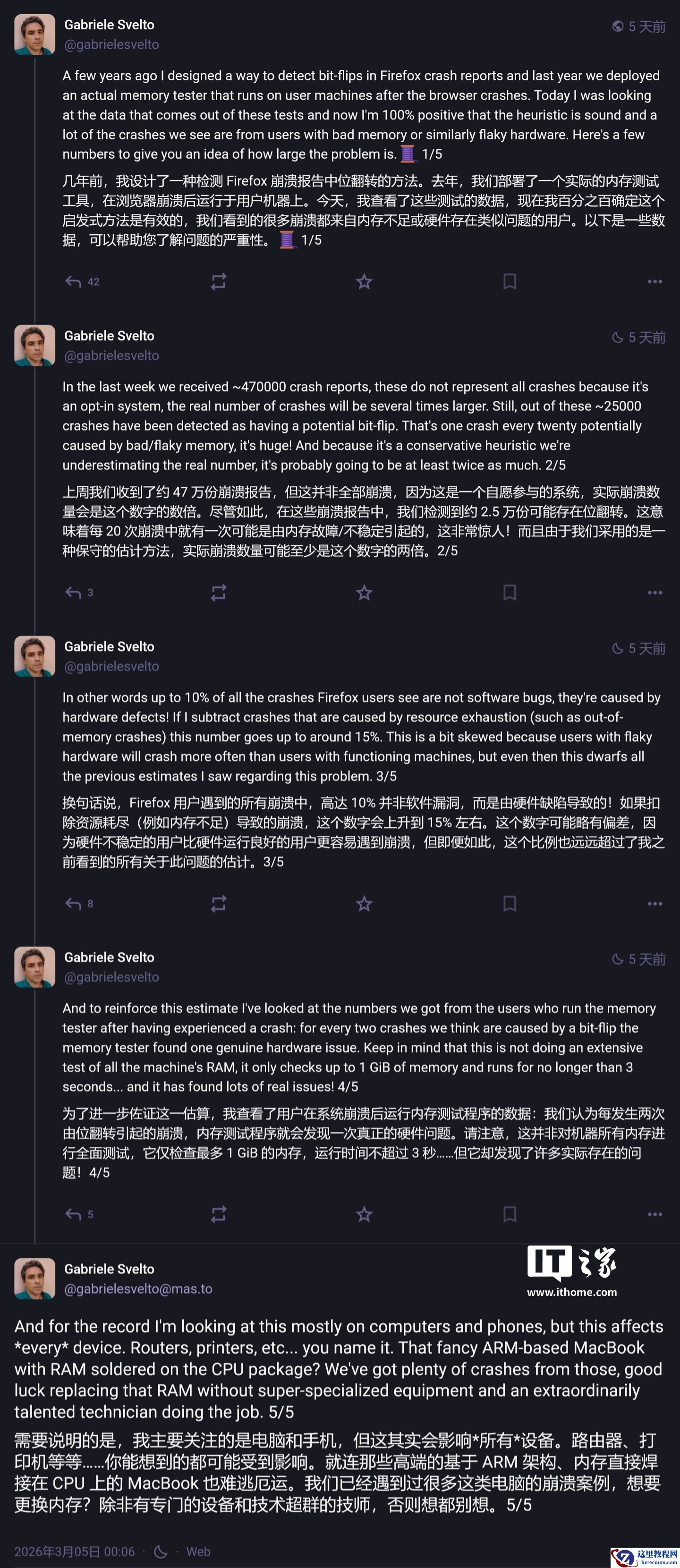 3 月 10 日消息,Mozilla 工程师 Gabriele Svelto 于 3 月 5 日在 Mastodon 平台发布动态,洞察分析导致火狐 Firefox 浏览器崩溃的原因,发现超过 10% 是由于内存芯片故障等物理硬件问题引发。