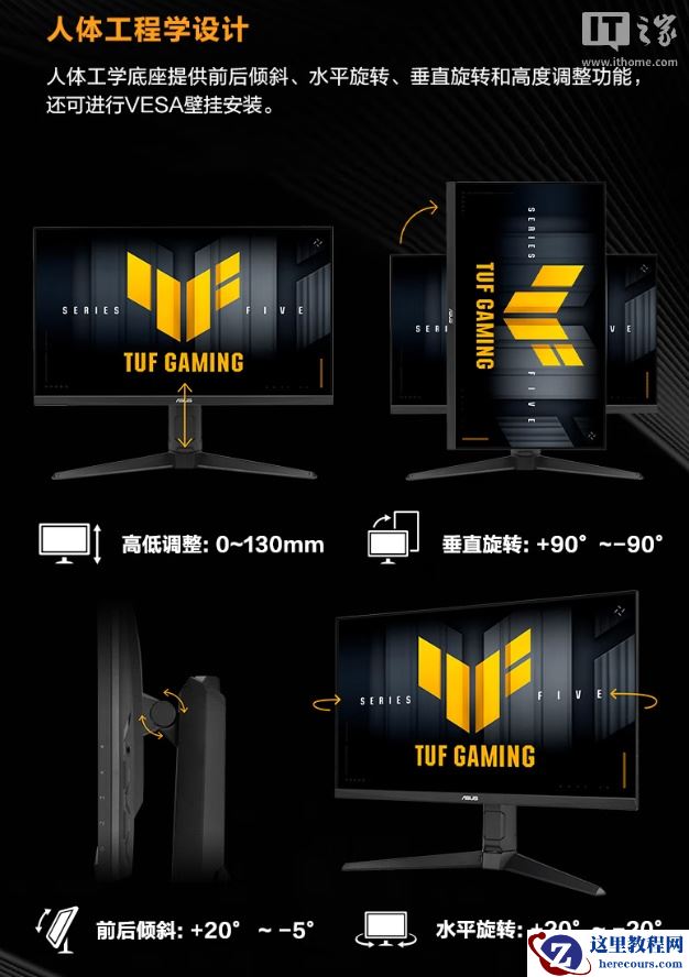 该机支架支持升降 / 倾斜 / 旋转,显示器配备 1 个 DisplayPort 1.4、2 个 HDMI 2.0、1 个音频输出插孔,内置 2 个 2W 扬声器。