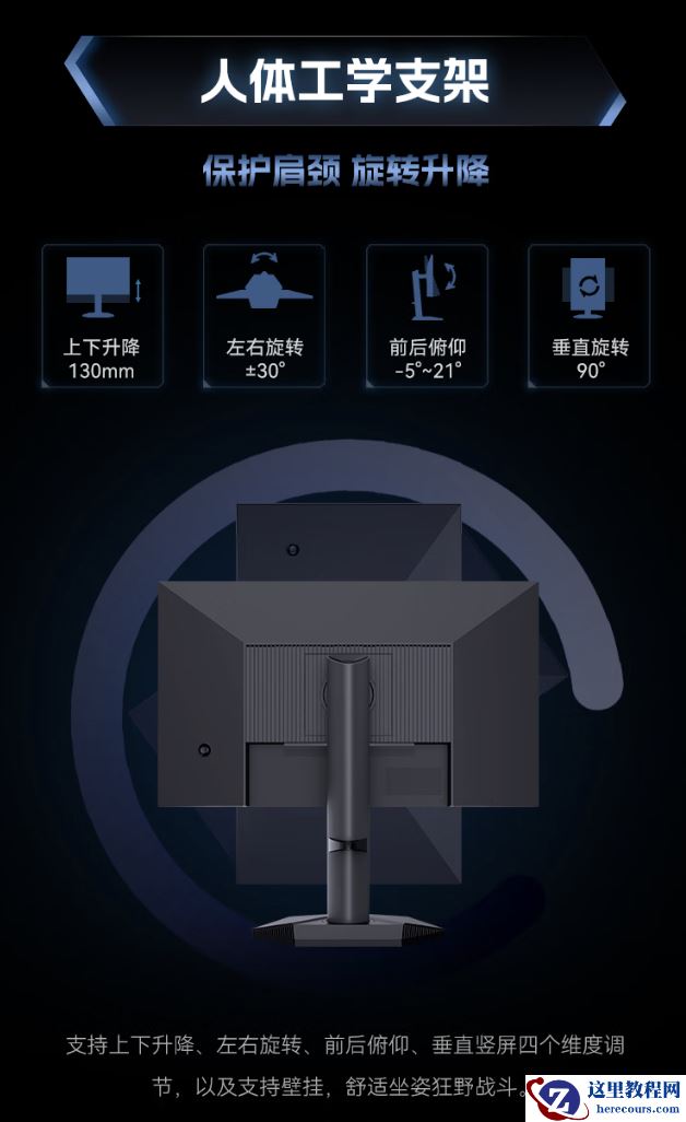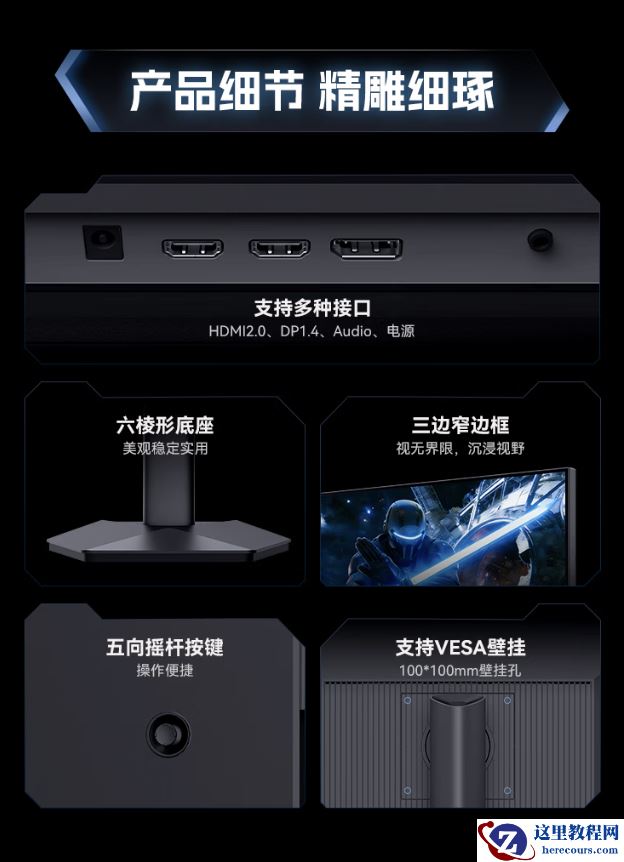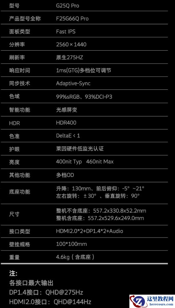 该机支架支持升降 / 俯仰 / 旋转(支架支持快拆),显示器本体支持 VESA 100x100mm 壁挂,提供 2 个 HDMI 2.0(144Hz)、2 个 DP 1.4(275Hz),1 个 3.5mm 音频接口。