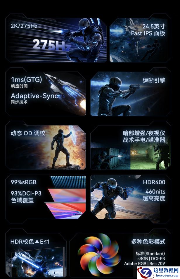 该机配备一块 2560x1440 分辨率 275Hz 原生 Fast IPS 面板,显示器峰值亮度 460 尼特,GtG 响应速度 1ms,覆盖 93% DCI-P3 和 99% sRGB 色域。
