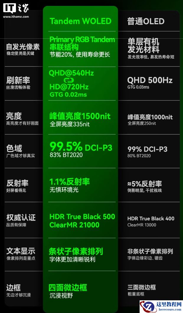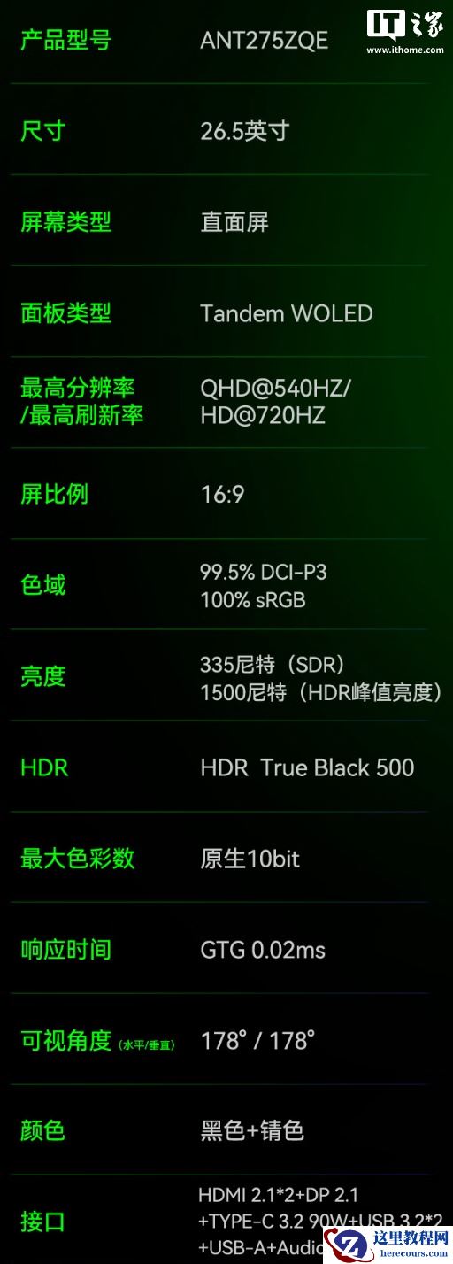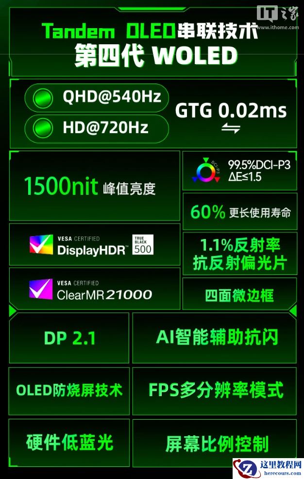该机配备的 LG 第四代 W-OLED 面板支持以 2560x1400 分辨率 540Hz 或 1280x720 分辨率 720Hz 显示,SDR 亮度 335 尼特,HDR 峰值亮度 1500 尼特,GtG 响应速度 0.02ms,显示器支持原生 10-Bit 色彩,覆盖 99.5% DCI-P3 色域。