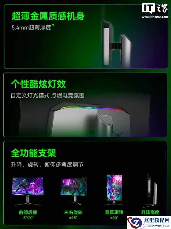 该机支架支持升降 / 倾斜 / 旋转,机身背面提供 RGB 氛围灯,机身本体支持 VESA 100x100mm 壁挂,提供 2 个 HDMI 2.1、1 个 DP 2.1、USB-C 90W、USB-A 3.2(KVM)接口。