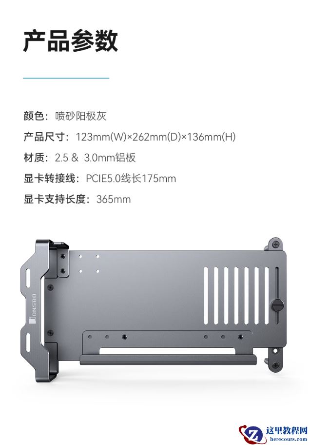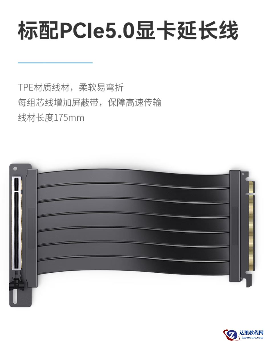 据介绍,这款产品采用 5052 高强度铝合金打造,带有细腻喷砂阳极工艺,标配 PCIe 5.0 显卡延长线,长度 175mm,采用 TPE 材质,每组芯线增加屏蔽带,保障高速传输。