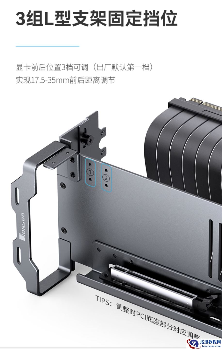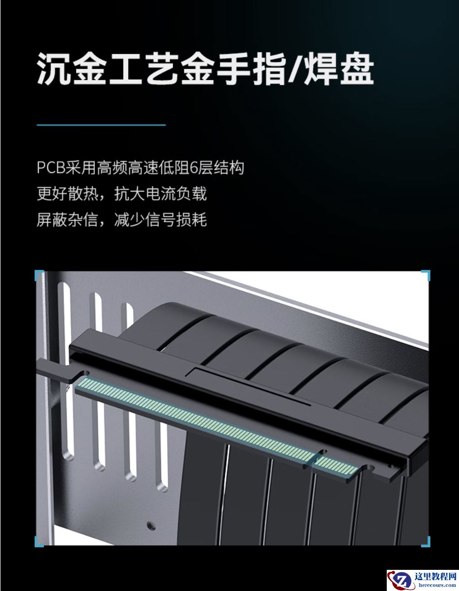 规格方面,这款产品带有沉金工艺金手指 / 焊盘,PCB 采用高频高速低阻 6 层架构,能够减少信号损耗,内置盔甲屏蔽罩插槽,减少撞击损坏,显卡前后位置可调 3 档,还能够调整上下位置。
