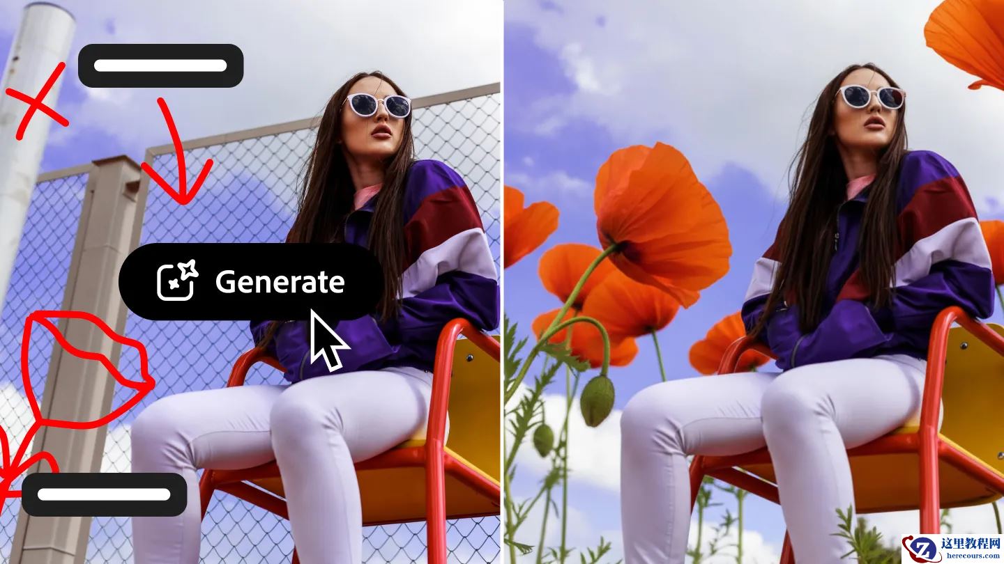 值得注意的是,Adobe 还为 Photoshop 推出了新功能“AI 标记”,可让用户通过手绘标记或简单草图生成完整图片,例如先画一朵花,然后让 AI 将其生成到画面中,或者先在物体上做标记,然后让 AI 自动删除对象并调整背景。