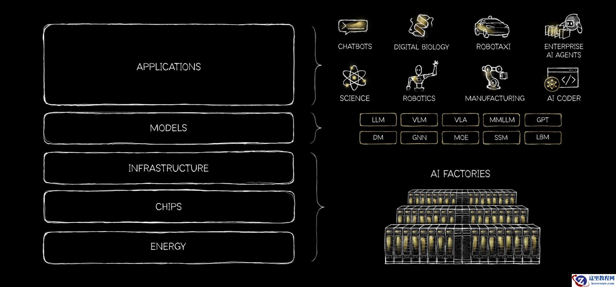 这就是“五层蛋糕”架构:能源 → 芯片 → 基础设施 → 模型 → 应用。