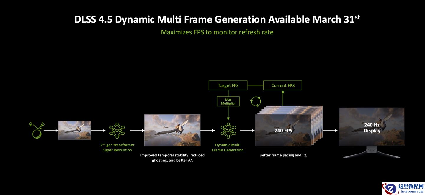 英伟达在发布会上宣布,RTX 50 系显卡玩家从 3 月 31 日起,可通过 NVIDIA App Beta 版启用六倍多帧生成、动态多帧生成两项功能,不过启用前需确保 Game Ready 驱动处于 595.79 WHQL 或更高版本。