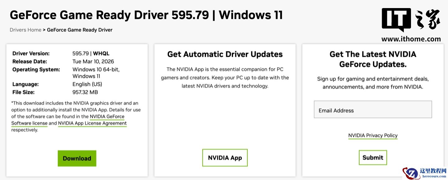 3 月 11 日消息,英伟达现已将旗下 Game Ready 游戏显卡驱动程序更新到了 595.79 版本,主要为《红色沙漠》《死亡搁浅 2:冥滩之上》进行优化适配,同时修复了此前几个版本中的多项 Bug。注意到,此驱动版本已得到了 WHQL 认证。