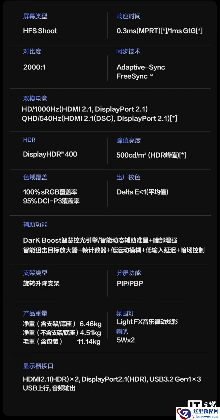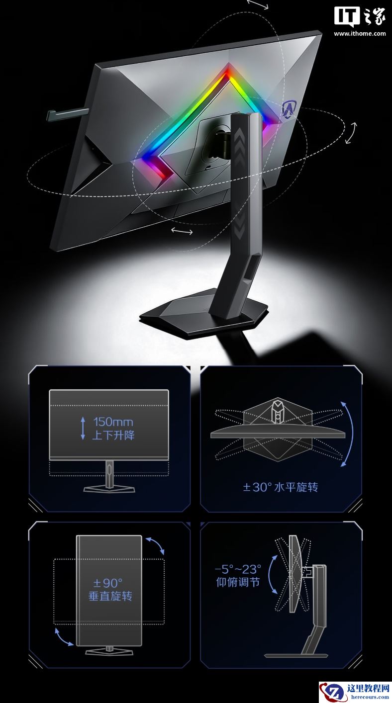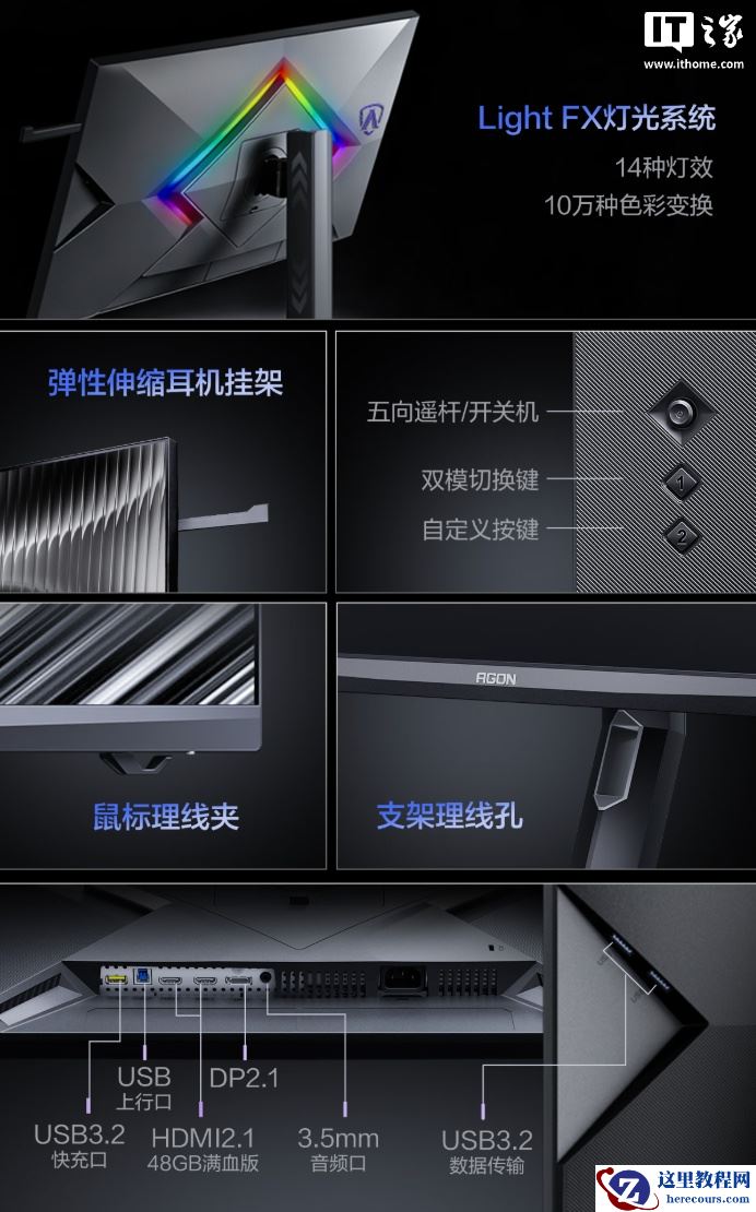 该机支架支持升降 / 倾斜 / 旋转,显示器本体支持 VESA 壁挂,拥有 Light FX 音乐律动炫彩氛围灯,同时提供双 5W 扬声器,I/O 方面提供 2 个 HDMI 2.1、1 个 DP 2.1、3 个 USB-A 3.2 Gen 1(KVM)、1 个 3.5mm 音频接口。