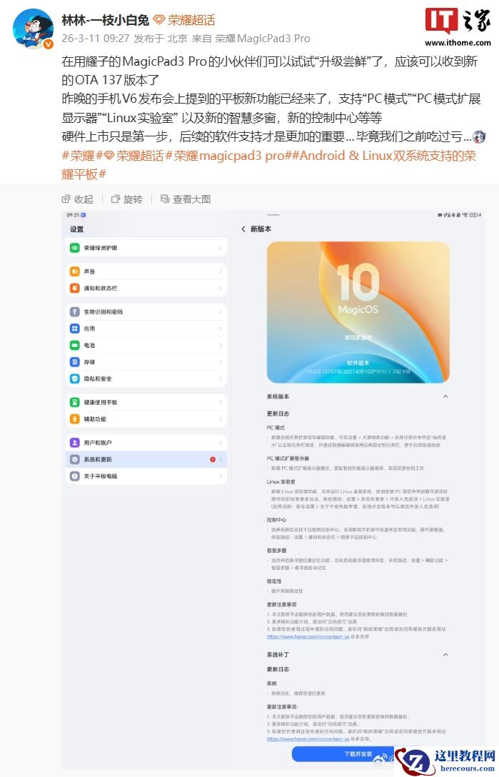 注意到,荣耀中国区智慧生活业务部部长林林今日发文宣布,MagicPad3 Pro 平板已开启“137”版本升级尝鲜,带来了发布会提到的系列新功能,包括 PC 模式、PC 模式扩展显示器、Linux 实验室、新智慧多窗以及新控制中心等。