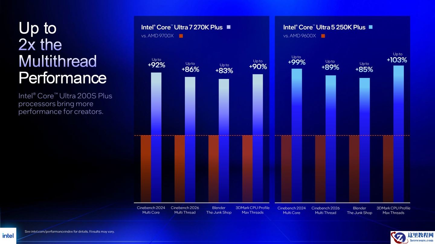 英特尔表示,该系列新品相较 AMD 竞品拥有近乎翻倍的性能优势。官方数据称,在 Win11 25H2 系统下,250K Plus 比 AMD R5 9600X 最高快 103%,而 270K Plus 则比 R7 9700X 最高快 92%。