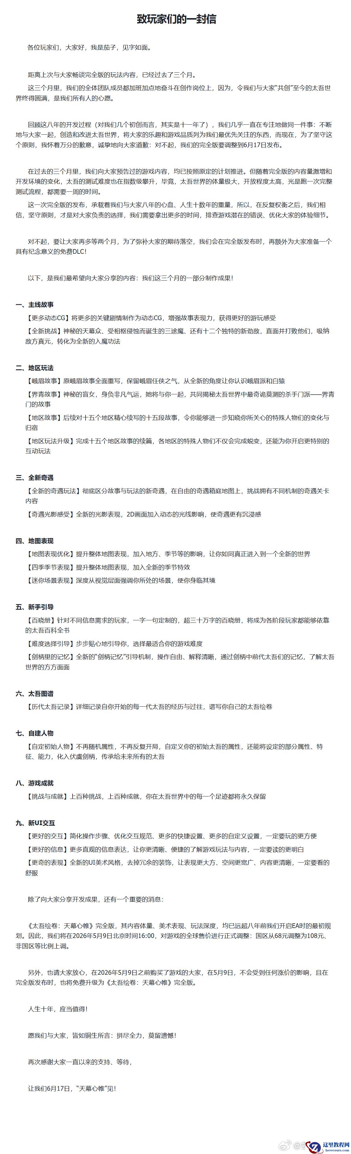 3 月 11 日消息,螺舟工作室今日发布了《致玩家们的一封信》,并宣布国产神话武侠题材独立游戏《太吾绘卷:天幕心帷》完全版定档 2026 年 6 月 17 日上线。