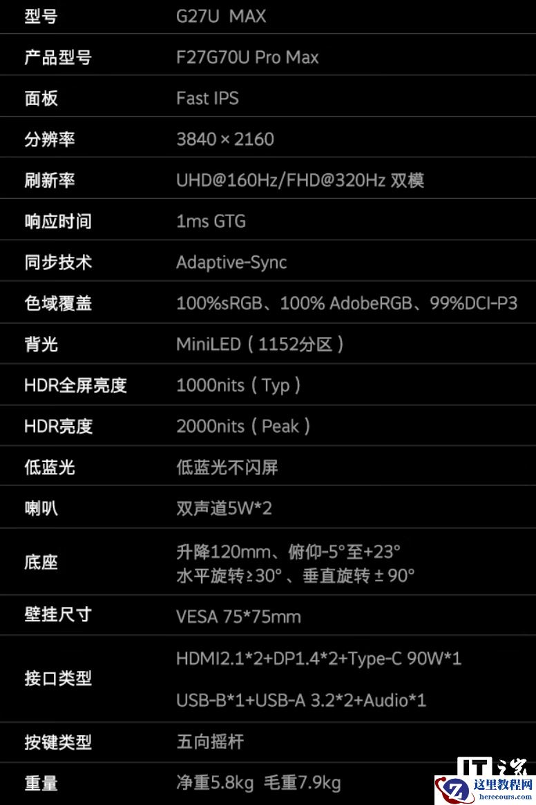 该机支架支持升降 / 倾斜 / 旋转,显示器本体支持 VESA 75x75mm 壁挂,提供双 5W 扬声器和光线传感器,显示器提供 2 个 HDMI 2.1、2 个 DP 1.4、1 个 USB-C 90W、2 个 USB-A 3.2(KVM)接口。