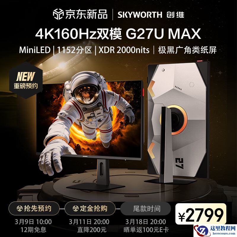 3 月 12 日消息,创维旗下“G27U MAX”27 英寸显示器目前已在京东开启预售,该产品主打 4K 160Hz / 1080P 320Hz 双模,定价为 2799 元。