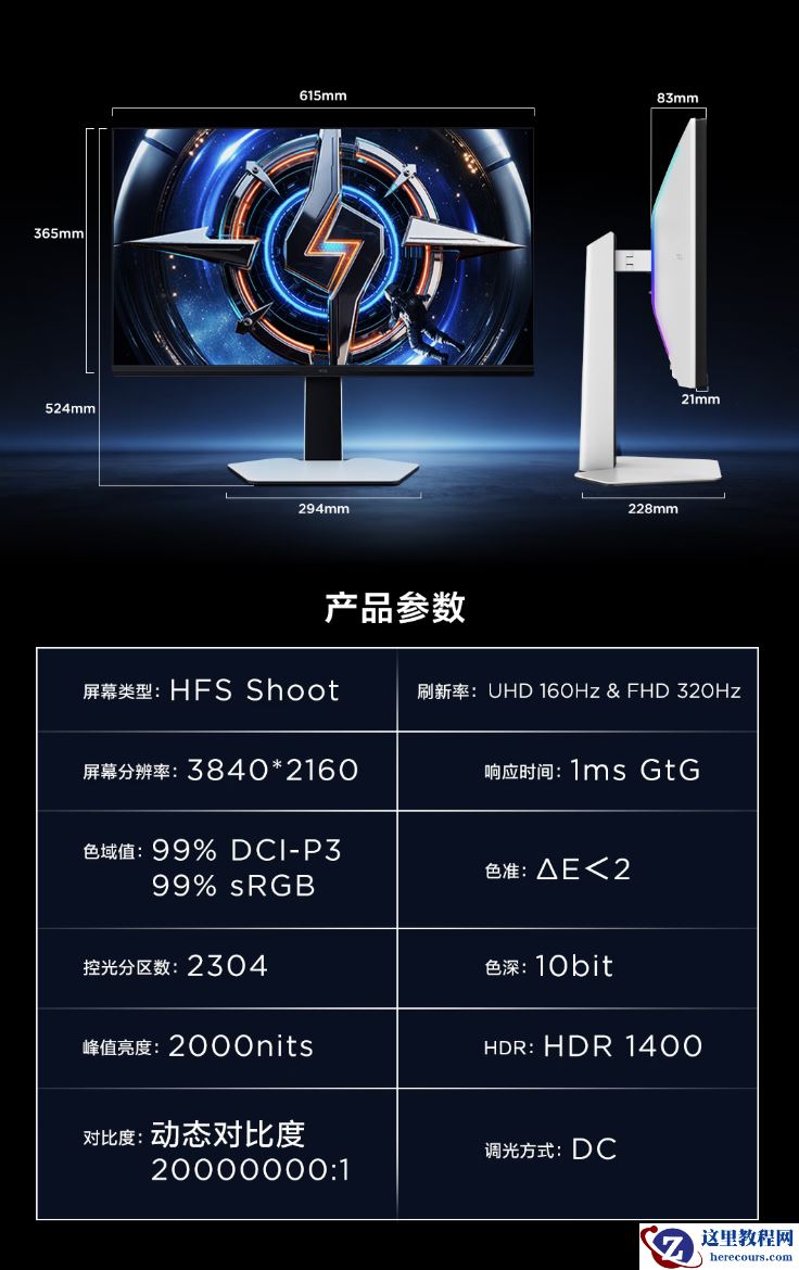该机配的 HFS Shoot 面板支持以 3840x2160 分辨率 160Hz 或者 1920x1080 分辨率 320Hz 显示,其 GtG 响应速度 1ms,HDR 峰值亮度 2000 尼特,支持 10-Bit 色彩。