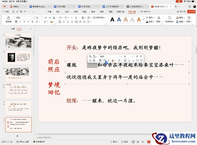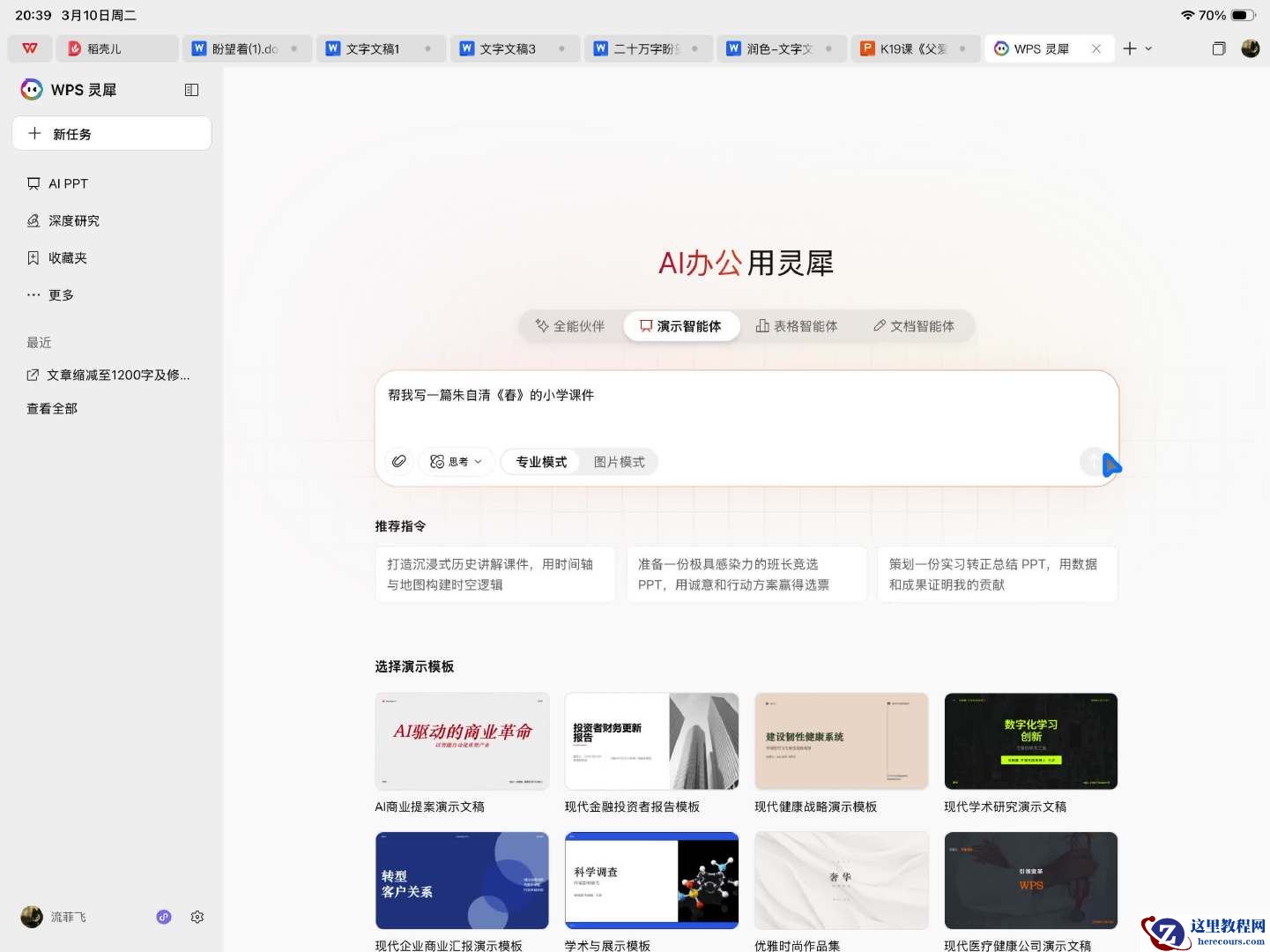 比如小编让 WPS 灵犀智能体帮我写一份朱自清散文《春》的教学课件,我只需对灵犀智能体说一句简单的指令,它就能帮我从 PPT 思路到文稿到大纲到成品,一口气完全做出来,并且整体效果很不错,整个过程只用了几分钟,比自己从头开始做快上数十倍。而小编只需要在此基础上修改就行了。在 iPad 上能够轻松完成这样的工作,放在过去确实是很难办到的。