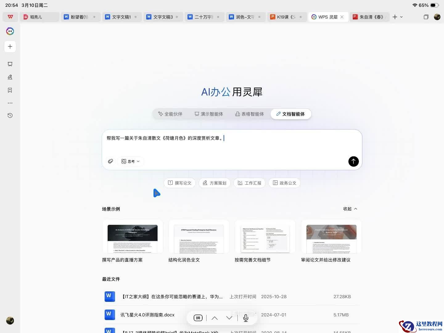 再比如文档创作方面,小编接着让 WPS 灵犀智能体帮我写一篇朱自清散文《荷塘月色》的深度赏析解读文章,灵犀智能体也很快帮我完成了一篇像模像样的解读文章,写完之后,还能直接创建文档,你可以用 WPS 灵犀智能体继续对文章按照你的想法进行修改。