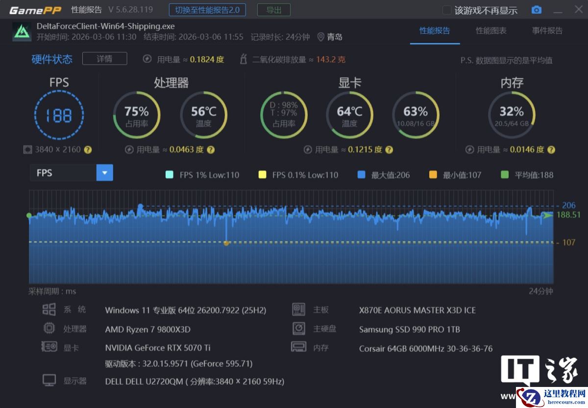在 2K 分辨率 + 极端画质下,游戏平均帧数为 184 帧,1% Low 帧为 143 帧;