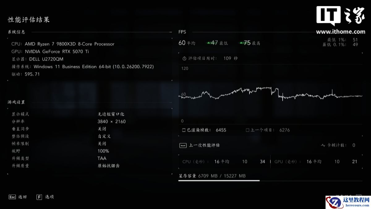 在 4K 分辨率 + 手动全高画质 + TAA 原始抗锯齿下,游戏平均帧数为 60 帧,1% Low 为 51 帧;
