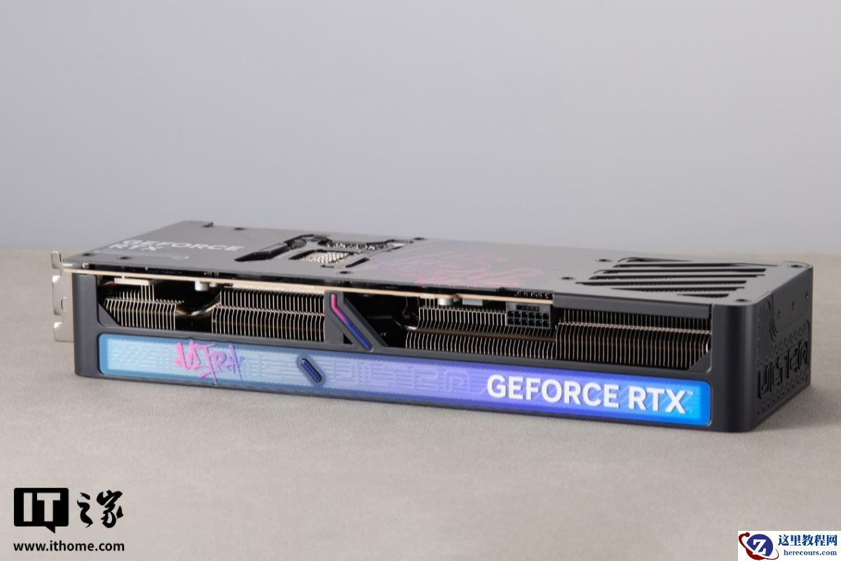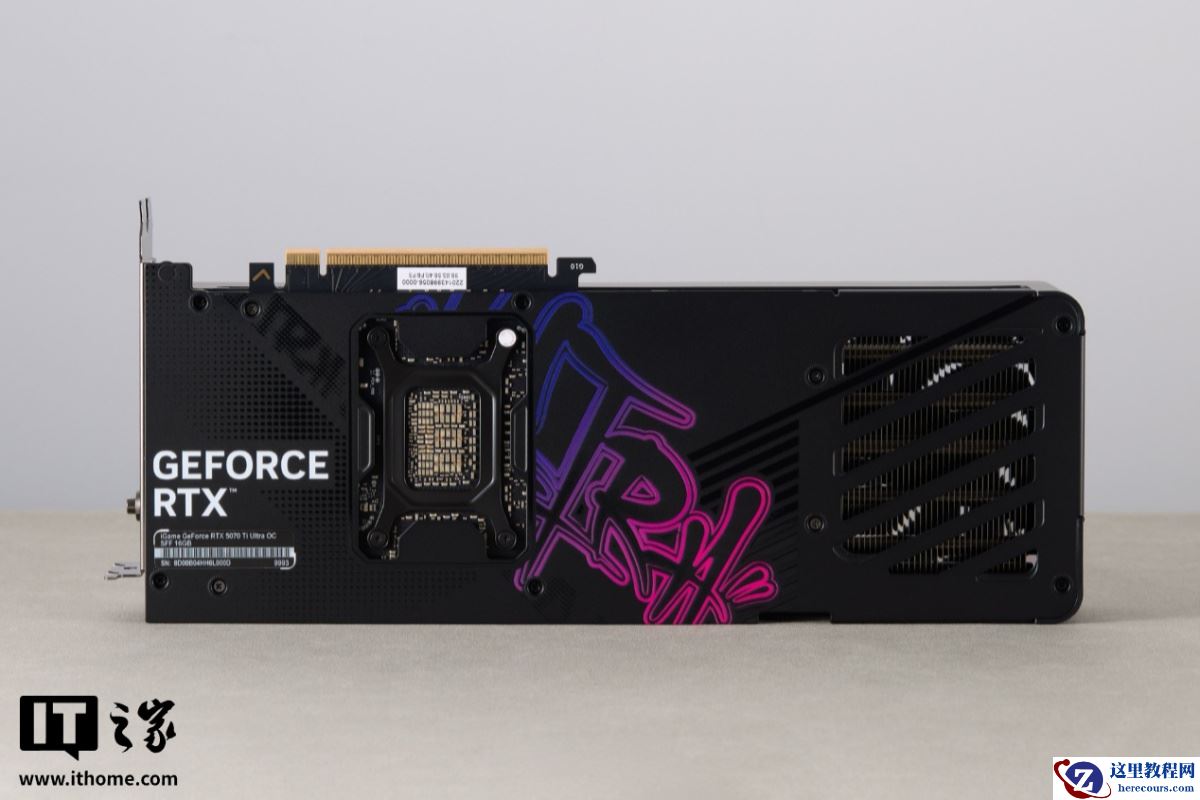侧面设计上,iGame RTX 5070 Ti Ultra SFF 显卡相比白色款明显更加“骚气”,渐变风格的亚克力灯罩非常吸睛,搭配艺术字风格的 Ultra 涂鸦 Logo 和内部若隐若现的半透明 Ultra 灯带,极具视觉张力。