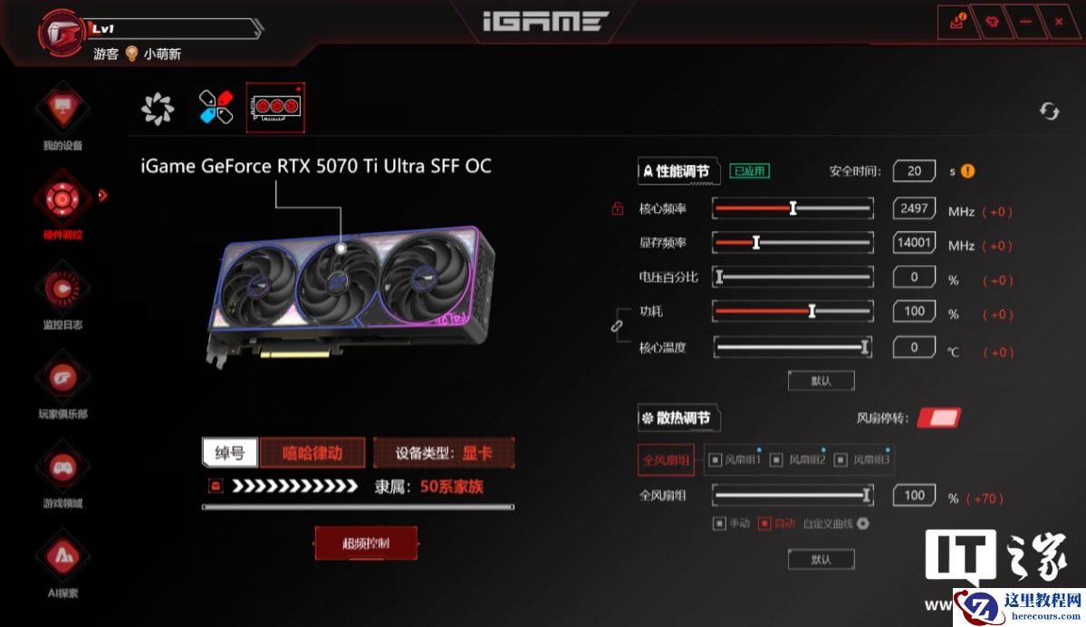 选择对应的硬件标签后,还能对硬件性能和功能进一步设置。以显卡为例,iGame 自在星球提供了软件超频选项,支持拉高显卡核心频率、显存频率、功耗上限等参数,赋予玩家解锁更强硬件性能的权力。也可以锁定显卡核心频率,自定义风扇转速,让显卡在重负载场景下发挥性能最大潜力,或者在轻负载场景下限制风扇转速保持静音。