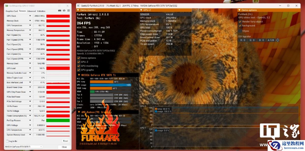 按照惯例我们先看烤机表现,打开显卡 I/O 接口面板上的超频模式按钮烤机 10 分钟,GPU 功耗为 300W,核心温度只有 65.7℃,显存温度为 64°C,GPU 工作频率为 2662MHz,很显然,三风扇设计加上内部散热堆料,能够轻松压住 300W 的功耗,确保性能释放的稳定。