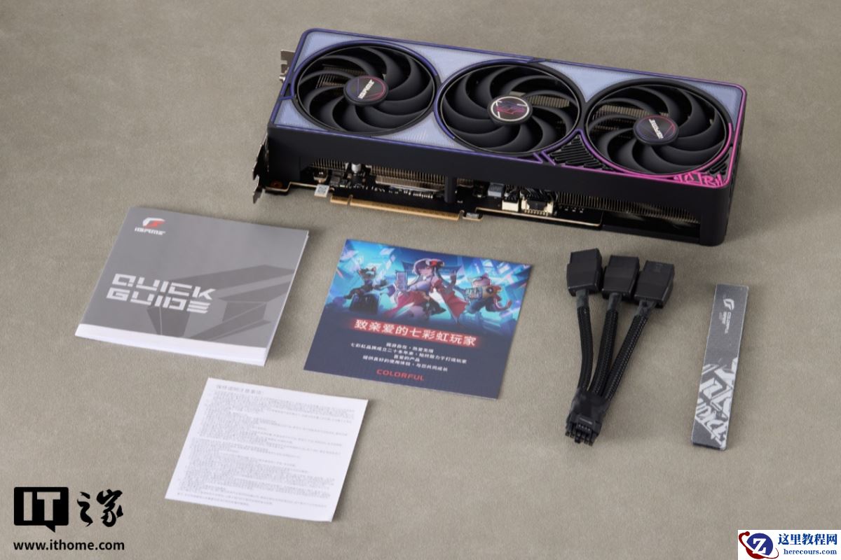 配件上,包装内附有一张欢迎卡片,1 根 16pin 转 3*8pin 的电源转接线,1 条线材扎带以及显卡使用说明册和保修说明卡。