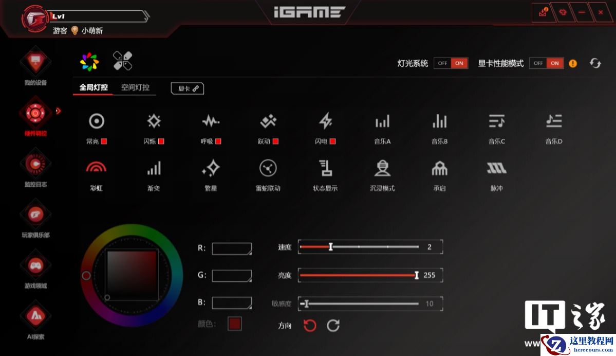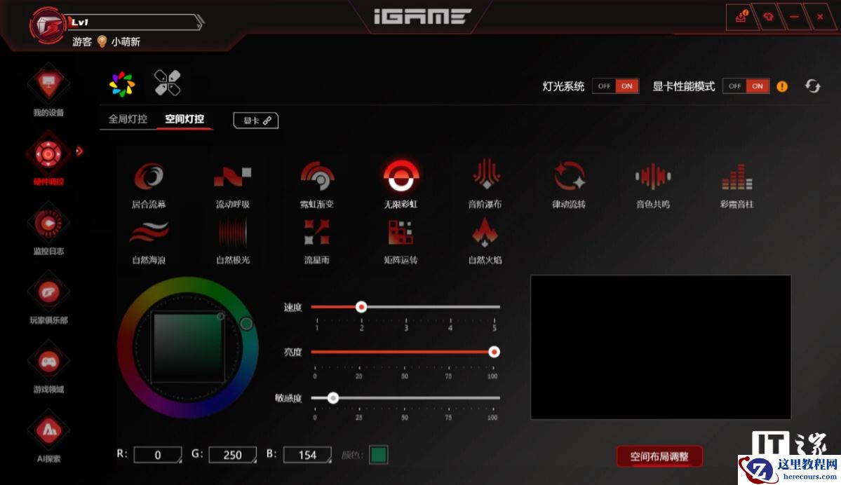 在硬件调控板块下,软件可以检测电脑中的自家硬件,并提供丰富的灯效控制和自定义选项,包括多种灯效预设,自定义灯光颜色、亮度、动画速度以及是否进行灯光联动,还可以同步 RGB 动态桌面壁纸,丰富性和炫酷程度拉满。