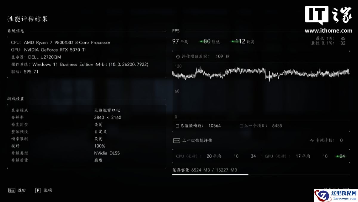 4K 分辨率下,游戏平均帧数为 97 帧,1% Low 为 85 帧;