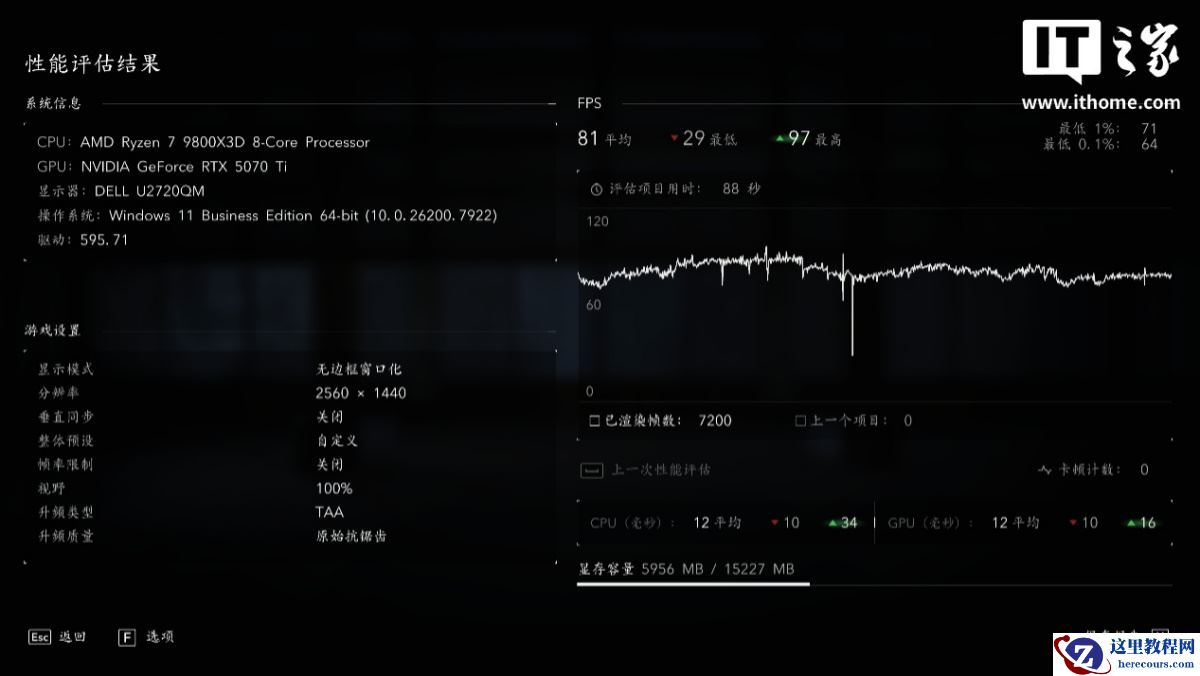 在 2K 分辨率 + 手动全高画质 + TAA 原始抗锯齿下,游戏平均帧数为 81 帧,1% Low 为 71 帧;