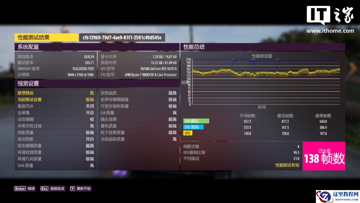 在 4K 分辨率 + 极端画质下,游戏平均帧数为 138 帧,1% Low 帧为 108 帧;
