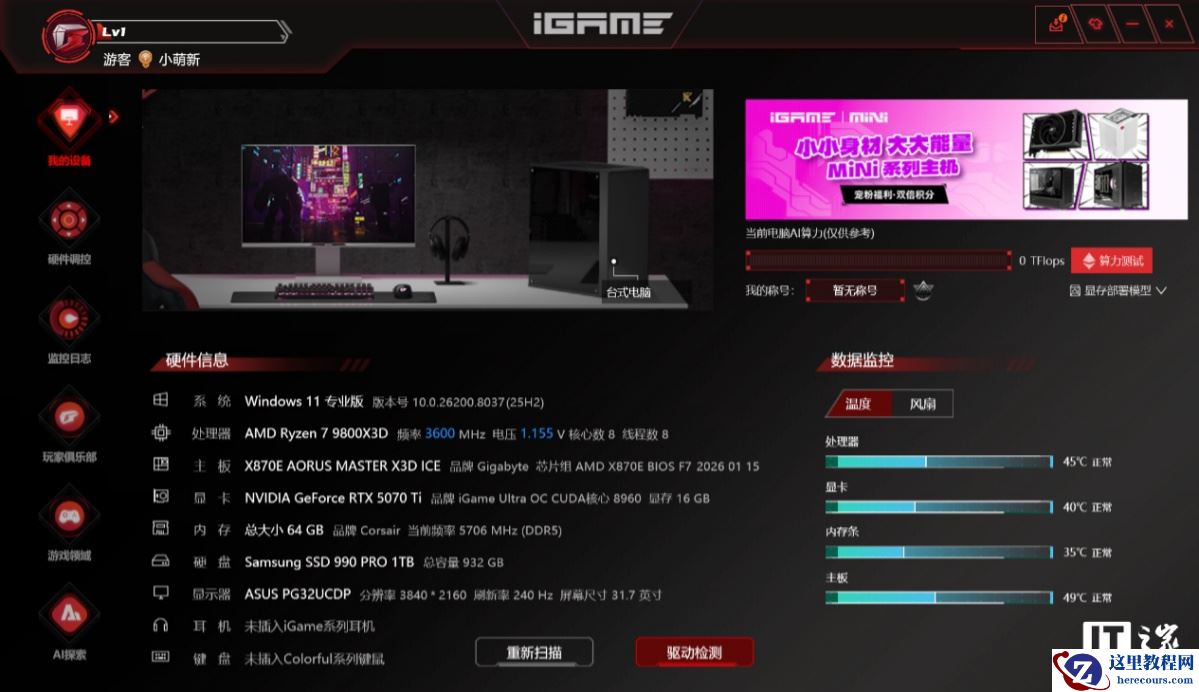 软件主页可以看到当前机器的详细配置信息以及核心硬件的温度监控、风扇转速监控等,还自带了算力测试工具,可以快速了解电脑的 AI 性能水平。