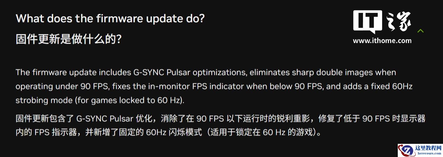 英伟达为解决这一痛点,在新固件中提升了低帧率下的处理效率。玩家现在即使处于不足 90 FPS 的游戏环境中,也能体验到极大减轻的动态模糊效果。