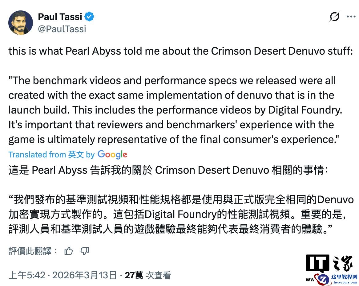 而 Pearl Abyss 对此表示:“我们之前发布的所有参数要求数据、演示视频,都是在开启 D 加密的情况下测得。当然 Digital Foundry(数毛社)那边的性能前瞻也是开启 D 加密测试的。我们希望评测人士测试的游戏性能表现能代表最终水平”。