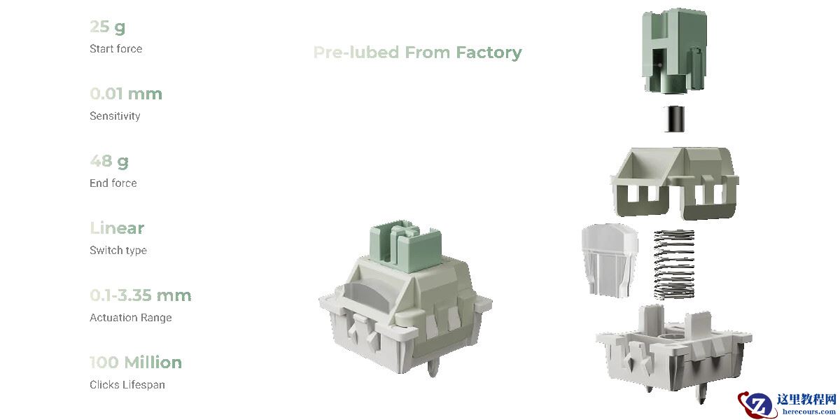 据介绍,该键盘共配备 35 个按键,带有数字键、QWERT 以及 F1-F5 等按键,外壳采用 ABS 塑料,内部拥有铝合金板,键帽则是双料注塑透光 ABS,搭载 Ultra-Fast Magnetic Lime 磁轴,触发压力 25g,总键程 3.35mm,采用全 POM 结构。